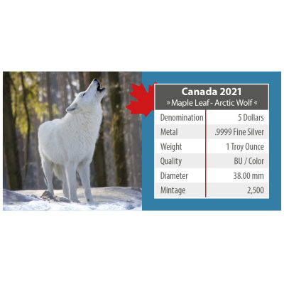 <<< Kanada - 5 CAD Maple Wildtiere Unterwegs Polarwolf 2021 - 1 Oz Silber Color | |