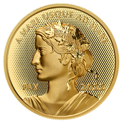 Das Motiv zeigt das Profil von Lady Peace, gekrönt von Ahornblättern. Ihr Gesicht wird von PAX 2021 und Kanadas nationalem Motto A MARI USQUE AD MARE (Von Meer zu Meer) begleitet. Die Münze trägt auch eine Randbeschriftung mit dem lateinischen Wort PAX, was Frieden bedeutet. Die Vorderseite zeigt das Bildnis Ihrer Majestät Königin Elizabeth II. Von Susanna Blunt. Die Münze besteht aus ca. 1 Oz Feingold in der Prägequalität Polierte Platte mit Sondereffekt des Hintergrunds und ist auf nur 500 Stück weltweit streng limitiert. Die Auslieferung erfolgt im Original-Etui mit Umverpackung und nummeriertem Echtheitszertifikat.