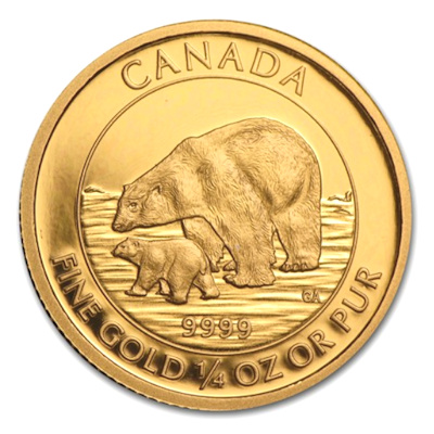 Es handelt sich hier um eine Prägung der Royal Canadian Mint in einer 1/4 Oz Feingold in der hohen Reinheit von 999.9%. Die Münze zeigt einen Polarbären mit einem Jungtier und ist in der Prägequalität Stempelglanz geprägt. Die Münze ist einzeln verschweißt. |
