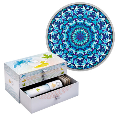 Diese Silbermünzen Serie der Royal Canadian Mint widmet sich dem Kaleidoskop. Die Serie umfaßt 3 Ausgaben zu je 1 Oz Feinsilber, die Münzen sind sehr dünn geprägt wodurch der Durchmesser ganze 60,00 mm beträgt. Die Prägung erfolgt in der höchsten Prägequalität Polierte Platte und die Münze ist zudem aufwendig coloriert. In der Erstausgabe ist ein aufwendiges Sammleretui sowie ein Kaleidoskop enthalten. Jedes Motiv besteht aus kleinen für Kanada typischen Motiven, so zeigen die Ausgaben: 1. Ausgabe: Polarbär 2. Ausgabe: Eistaucher 3. Ausgabe: Maple Leaf (Ahornblatt) Von jeder Münze werden streng limitiert nur 7.500 Stück verausgabt! |
