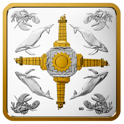 Die Leuchttürme von der atlantischen Küste Kanadas verkörpern die Geschichte und den Geist unserer felsigen Ostküste, wo sich die Landschaft von steil aufragenden Klippen zu malerischen Buchten verändert. Die letzte Ausgabe der Küstenserie Kanadas bringt uns an die Atlantikküste, wo in Kanada die Sonne zuerst aufgeht; Auf der quadratischen Rückseite hebt eine selektiv vergoldete Anordnung ikonischer Bilder das reiche maritime Erbe des Atlantiks hervor und betont gleichzeitig unsere dauerhafte Verbindung mit dem Meer. |