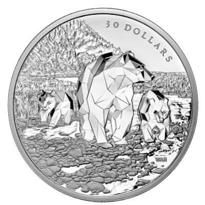 Diese wunderschöne Feinsilbermünze der Royal Canadian Mint ist die zweite Ausgabe der Serie Multifacetten Tiere und zeigt den Grizzly Bär mit zwei Jungtieren.