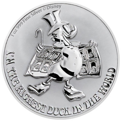 Diese Jubiläumsausgabe erscheint zu 75. Jahre Dagobert Duck(TM) oder wie er im Original heißt Scrooge McDuck(TM). Die Münze besteht aus 1 Oz Feinsilber in der Prägequalität Stempelglanz und wird zu je 25 Stück in Originaltubes verausgabt. Einzelstücke werden in Münztasche verpackt ausgeliefert. Die Auflage beträgt lediglich 15.000 Stück weltweit.