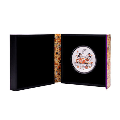 Diese neue 2 Oz Feinsilbermünze zeigt Disneys(TM) Mickey Mouse(TM) und Minnie Mouse(TM) bei einer Halloween Feier. Die Münze ist aufwendig coloriert und in der höchste Prägequalität Polierte Platte geprägt.