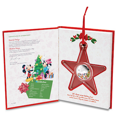 Diese Weihnachtsgrüße von Disney sind nicht nur wunderschön anzusehen, sondern können auch als Weihnachtsbaumschmuck verwendet werden. Die Münze ist wunderschön coloriert und in einen transparten Stern mit roter Schlaufe eingefaßt, der sich direkt an Ihren Christbaum hängen läßt. Natürlich ist diese auf nur 10.000 Stück streng limitierte Ausgabe auch ideal zum Verschenken geeignet.