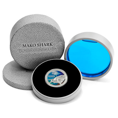 Mit dem Kurzflossen Makohai erscheint die 5. Ausgabe aus der Serie Oceans Predators (Jäger der Ozeane). Die Ausgabe ist wie bereits die Vorgänger Münzen auf lediglich 2.000 Stück weltweit limitiert und dürfte ebenfalls wie die Vorgänger schnell vergriffen sein. Die Verpackung mit Wassereffekt rundet diese wunderschön colorierte und in höchster Prägequalität Polierte Platte produzierte Münze perfekt ab.
