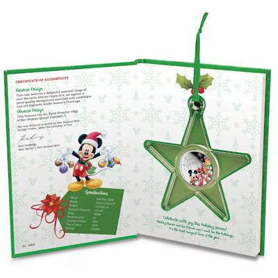 Diese Weihnachtsgrüße von Disney sind nicht nur wunderschön anzusehen, sondern können auch als Weihnachtsbaumschmuck verwendet werden. Die Münze ist wunderschön coloriert und in einen transparten Stern mit grüner Schlaufe eingefaßt, der sich direkt an Ihren Christbaum hängen läßt. Natürlich ist diese auf nur 10.000 Stück streng limitierte Ausgabe auch ideal zum Verschenken geeignet.