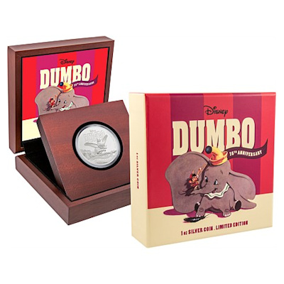 Wer kennt ihn nicht, den kleinen Elefanten mit den großen Ohren der fliegen kann. Disney`s Dumbo feiert sein 75. Jubiläum, Anlass genug ihm eine eigene Silbermünze zu widmen. Die Münze besteht aus 1 Oz Feinsilber in der höchsten Prägequalität Polierte Platte und ist auf nur 10.000 Stück streng limitiert. Die Auslieferung erfolgt im Original-Etui mit Umverpackung und nummeriertem Echtheitszertifikat.