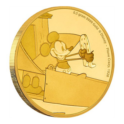 Die Disney Münzen Ausgabe aus der Reihe Mickey Mouse im Wandel der Zeit zeigt hier die Mickey Mouse im verrückten Flugzeug (Plane Crazy)