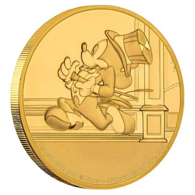 Die Disney Münzen Ausgabe aus der Reihe Mickey Mouse im Wandel der Zeit zeigt hier zeigt hier die Mickey Mouse Delayed Date (Mickey mit Verspätung).