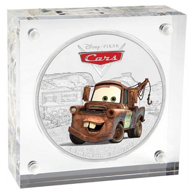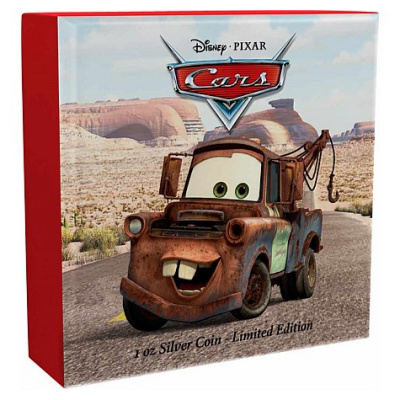 Es handelt sich hier um Tow Mater aus dem Disney Pixar Film Cars. Die Münze besteht aus 1 Oz Feinsilber in der höchsten Prägequalität Polierte Platte, ist aufwendig coloriert und ist auf nur 10.000 Stück weltweit streng limitiert. Die Auslieferung erfolgt im Original-Präsentationsetui mit Umverpackung und nummeriertem Echtheitszertifikat.
