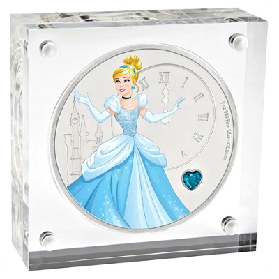 Diese Erstprägung als 1oz Silbermünze von Disney Princess mit einem Edelstein besetzt zeigt ein entzückend coloriertes Bild von Cinderella in ihrem Ballkleid. Ihr Mieder funkelt mit Glitzer. Im Hintergrund sind ikonische Bilder von Aschenputtels Schloss und der Uhr mit der Uhrzeit Mitternacht eingraviert. Die Besetzung der Münze mit einem schimmernden herzförmigen Aqua-Edelsteins vervollständigt das Design.