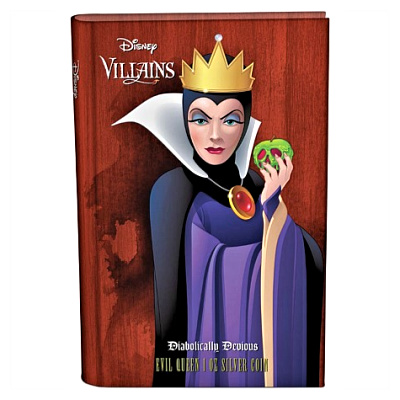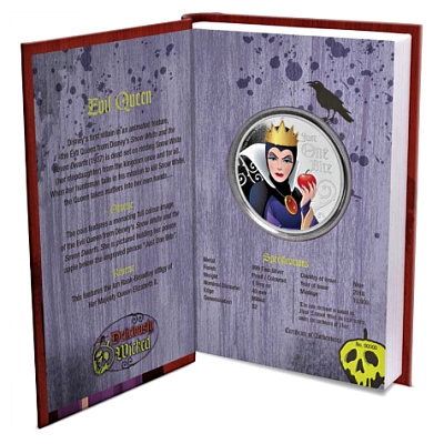 Diese neue Disney Silbermünze zeigt ein vollfarbiges Bild der bedrohlichen Königin aus Disneys Schneewittchen und den sieben Zwergen. Sie hält ihren Giftapfel unter der eingravierten Phrase Just One Bite, nur ein Biss.