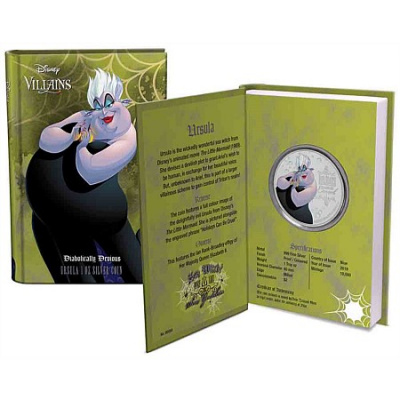 Die vierte 1 Oz Silbermünze in der Disney Villains Coin Collection (Disney`s Bösewichter) zeigt ein bösartig wunderschönes Farbbild der schrecklichen Seehexe Ursula aus Disney The Little Mermaid. Vollfarbig vor einem gravierten Hintergrund dargestellt, wird sie von der Phrase Ferien können grausam sein begleitet.