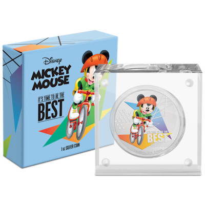 Es handelt sich um die 3. Ausgabe der neuen Sportserie von Disneys Mickey Mouse und zeigt das Motiv Radfahren. Die Münze besteht aus 1 Oz Feinsilber in der höchsten Prägequalität Polierte Platte ist aufwendig coloriert und ist auf nur 2.000 Stück weltweit streng limitiert. Die Auslieferung erfolgt im Original-Etui mit Umverpackung und nummeriertem Echtheitszertifikat.