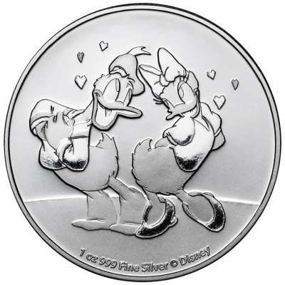 Die nächste Disney 1 Oz Silber Anlagemünze mit geringer Auflage widmet sich Donald und Daisy. Die Ausgabe ist limitiert auf nur 15.000 Stück weltweit. Die Münze besteht aus 1 Oz Feinsilber in der Reinheit 999/1000 und wird zu 25 Stück in Kunststofftubes bzw. zu 250 Stück in Masterpacks verausgabt.