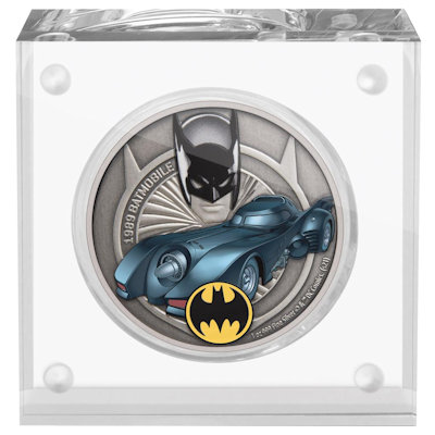 Diese Batman Sammlermünzenserie widmet sich ganz den Batmobilen. Die zweite Ausgabe zeigt das Batmobil von 1989. Die Münze besteht aus 1 Oz Feinsilber in der höchsten Prägequalität Polierte Platte, ist aufwendig coloriert und ist auf nur 2.000 Stück weltweit streng limitiert. Die Auslieferung erfolgt im Original-Etui mit Umverpackung und nummeriertem Echtheitszertifikat.