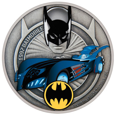 Diese Batman Sammlermünzenserie widmet sich ganz den Batmobilen. Die 3. Ausgabe zeigt das Batmobil von 1997. Die Münze besteht aus 1 Oz Feinsilber in der höchsten Prägequalität Polierte Platte, ist aufwendig coloriert und ist auf nur 2.000 Stück weltweit streng limitiert. Die Auslieferung erfolgt im Original-Etui mit Umverpackung und nummeriertem Echtheitszertifikat.