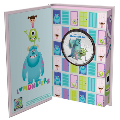 Diese offiziell lizenzierte Sammlermünze feiert das 20-jährige Jubiläum von Disney und Pixars Monsters, Inc., das am 2. November 2001 uraufgeführt wurde.