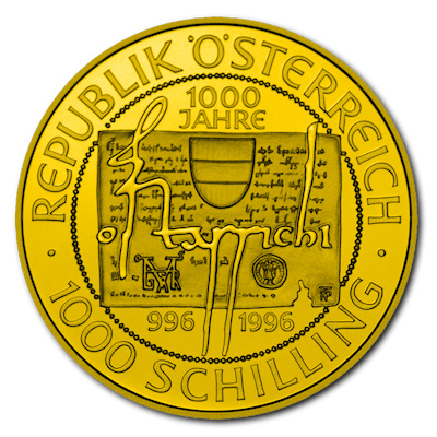 Die von der Münze Österreich verausgabte Goldmünze in der höchsten Prägequalität Polierte Platte stammt aus der Millenium Serie und zeigt die Ostarrichi-Urkunde Ottos des III. aus dem Jahre 996. Die Münze beinhaltet 16g Feingold hat einen Nennwert von 1.000 Schilling und stammt von 1995.
