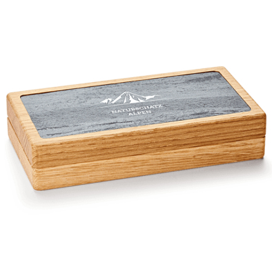 Schon für sich eine kleine Kostbarkeit: In den Deckel des Kästchens ist eine Schieferplatte eingesenkt, umrahmt von behutsam verarbeiteter Eiche, lediglich geölt, sonst naturbelassen und – wie die Münzen selbst – in Österreich produziert.