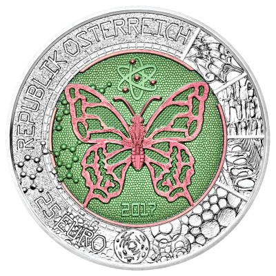 Die Wertseite zeigt im himbeerrot und grasgrünen Niob einen Schmetterling mit ausgebreiteten Flügeln. Darüber befindet sich ein Atom-Symbol. Links sind Teile einer Molekülkette zu sehen, die vom Silberring ausgehend in den Niobteil reichen. Die Motive im Silberring zeigen vergrößerte Details des Hauptmotivs. Rechts beginnend: der Ausschnitt eines Schmetterlingsflügels, dann im Uhrzeigersinn: die Vergrößerung desselben unter einem Mikroskop sowie die unter einem Elektronenmikroskop, weiters Zellstrukturen, schließlich eine Zelle mit Zellkern. Auf der anderen Seite spannt sich das Fragment einer Zelle über die Pille, darin, oben beginnend: ausschnittweise ein Strahlentierchen, dann im Uhrzeigersinn ein tetraedrisch angeordnetes Molekül, die Vollansicht eines Strahlentierchens sowie eine Biene. Innerhalb eines Hexagons platziert, ist rechts im Silberring der Aufbau eines Virus mit Membranhülle zu sehen. Im Uhrzeigersinn folgen Polioviren, dann wendelförmige Spirillen und Kokken (die letztgenannten beiden sind ebenfalls von Sechsecken umgeben), weiters ein Strahlentierchen und ein Zellteilungsprozess. Neben den drei Sechsecken sind Moleküle angedeutet. Die Münze ist bei der Prägeanstalt bereits jetzt komplett ausverkauft! |