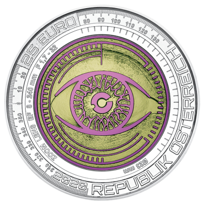 Die bunte Brillanz unserer Silber-Niob-Münzen ergibt sich aus einem innovativen Verfahren, dem „anodischen Oxidieren“, und sie trägt dazu bei, auf gesellschaftlich relevante technische Entwicklungen aufmerksam zu machen: diesfalls auf die Gefährdung der Privatsphäre in Zeiten von Big Data. Digitalisierung und Internet eröffnen dem Einzelnen nie dagewesene Möglichkeiten: ohne viel Aufwand durch ein Allwissen zu streifen und ohne Einschränkungen zu senden und zu empfangen. Doch was so leicht zugänglich ist, hat doch seinen Preis. Im Visier der Datensammler Mit dem Gläsernen Menschen, einer Metapher im Zusammenhang mit dem Datenschutz, war in der Vergangenheit vor allem ein von einem überwachenden Staat durchleuchteter Mensch gemeint. Als bildliches Symbol dafür gilt die Videoüberwachung öffentlicher Orte. Im Zuge des Allgemeinwerdens elektronischer Datenverwaltung hat sich der Begriff ausgeweitet und findet auf mehrere Bereiche Anwendung. Im Gesundheitswesen etwa ist von einem Gläsernen Patienten die Rede, in arbeitsrechtlichen Zusammenhängen von einem Gläsernen Mitarbeiter, in der Konsumwelt von einem ebensolchen Kunden. Während Sie etwas im Internet in Erfahrung bringen, was alles erfährt dabei das Internet über Sie? Smartphone, Apps, intelligente Assistenzsysteme, Kundenkarten, Kreditkarten, Laptop, Computer sammeln Informationen über Sie und ziehen Schlüsse daraus. Beim Surfen hinterlässt man Spuren, und Unternehmen nützen diese Daten, um dem Gusto des einzelnen Konsumenten auf die Schliche zu kommen. Firmen sind darauf spezialisiert, diese Informationen zu sammeln und mit ihnen zu handeln. Die Datenwirtschaft birgt somit die Gefahr, dass der Bürger und Kunde seiner Privatsphäre und seiner Souveränität verlustig geht. Doch für jeden, dem Teilhabe an der Gegenwart wichtig ist, ist die digitale Welt alternativlos. Wie kann man also aus der neuen Technologie Nutzen ziehen, ohne deren Nachteile in Kauf zu nehmen? Wie können wir uns vor digitaler “home invasion” und „mind invasion“ schützen? Die Münzbilder Die Wertseite zeigt im Niobkern ein menschliches Auge, das einerseits für Überwachung steht, andererseits auf die biometrische Methode der Iriserkennung verweist. Der Ring aus Silber ist einem Kameraobjektiv nachempfunden. Das Auge besitzt zwei Ebenen: Die untere besteht aus einem Relief, das grünlich schimmert. Darüber legt sich ein „zweites“ Auge, ein violettes. Es ist wie ein Logo gestaltet. Das gibt dem Motiv Tiefe. Der Blick fesselt und irritiert. Auf der anderen Seite steht der Mensch unter Beobachtung einer Kamera, wie es das REC-Symbol und die eingeblendete Laufzeit 20:20 erkennen lassen. Im Niob ist eine von mehreren menschlichen Silhouetten in den Vordergrund gerückt. Aus ihr entstehen einzelne Quadrate. Diese symbolisieren die persönlichen Daten, die über eine Person gesammelt werden. |