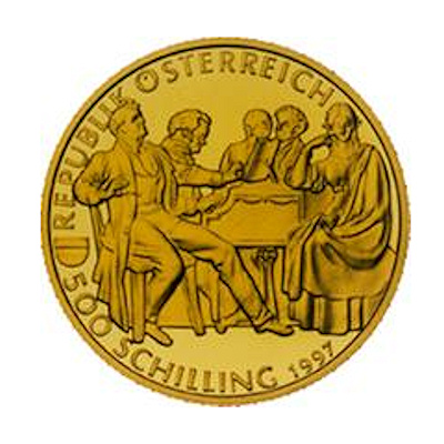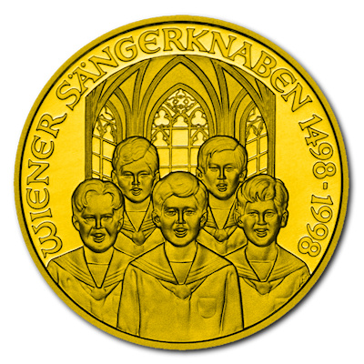 Die Serie Wiener Musiklegenden lief von 1997 bis 1999 und umfaßte 3 Ausgaben mit einem Nennwert von je 500 Schilling einer Auflage von je 50.000 Stück und einem Gewicht von 8,04 Gramm bei 995/1000 Gold Reinheit. Es wurden die Motive Franz Schubert, 500 Jahre Wiener Sängerknaben und Johann Strauß Vater und Sohn verausgabt. | |