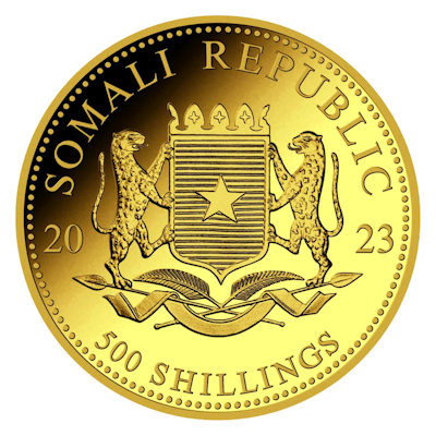 <<< Somalia - 500 Shillings Elefant 2023 - 1/2 Oz Gold | |