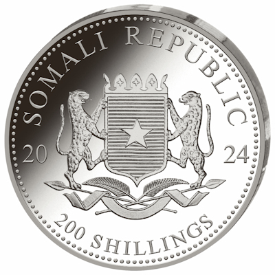 Technische Daten: Ausgabeland: Somalia Prägeanstalt: Ausgabejahr: 2024 Nennwert: 200 Shilling Material: Silber Gewicht: 62,20600g Durchmesser: 51,00 mm Prägequalität: Stempelglanz Verpackung: Einzeln gekapselt |
