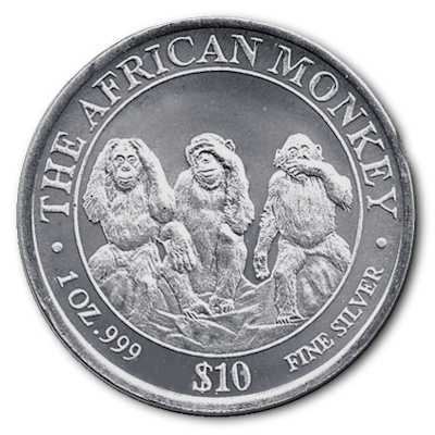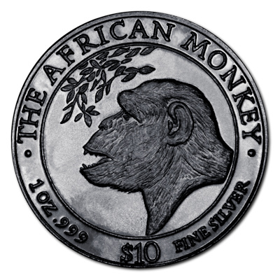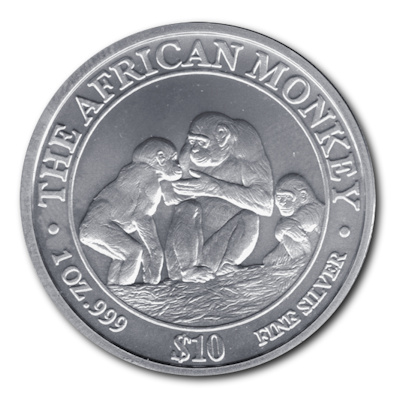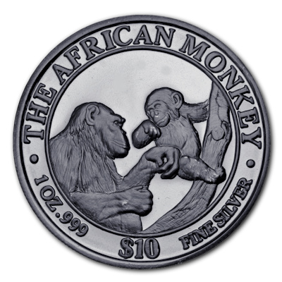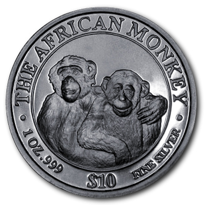 Die Münzserie The African Monkey wurde von 1998 bis 2004 verausgabt. Die Münzen bestehen aus 1 Oz Feinsilber und zeigen auf der Motivseite jährlich wechselnde Affenmotive. Auf der Rückseite ist der Afrikanische Kontinent sowie der Schriftzug Somali Republic und das Wappen von Somalia nebst Jahreszahl abgebildet. Der Nennwert der Münze beträgt $10. Jede Ausgabe wurde in einer geringen Stückzahl von lediglich 10.000 Stück verausgabt. | |