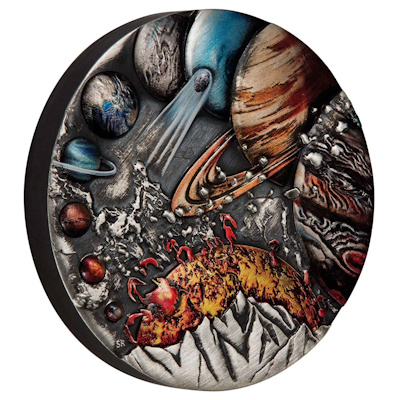 Die neun Planeten des Sonnensystems umfassen vier felsige Versionen, darunter die Erde, die der Sonne am nächsten liegt. Weiter entfernt verschmolzen Gas und Eis zu vier Gasriesen – riesigen Körpern, die hauptsächlich aus Wasserstoff und Helium bestehen. Noch weiter entfernt umkreist der einzige Zwergplanet des Sonnensystems die Sonne in einer durchschnittlichen Entfernung von 5,8 Milliarden Kilometern. Diese wunderschön gestaltete Münze ist in Antik Finish veredelt und zudem coloriert. Die Münze ist mit nur 388 Stück weltweit stark limitiert und bei der Prägeanstalt bereits komplett ausverkauft. Die Ausgabe kommt im Original-Etui mit Umverpackung und nummeriertem Echtheitszertifikat.