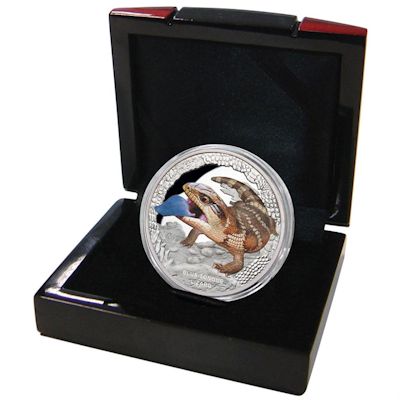 Die dritte Ausgabe aus der Serie Australian Remarkable Reptils zeigt den Blauzungenskink (Blue Tongue Lizard). Diese 1 Oz Feinsilber schwere Münze ist nicht nur in höchster Prägequalität Polierte Platte geprägt sondern zudem aufwendig und farbenprächtig coloriert. Die Auslieferung erfolgt in einem edlen Etui mit serienspezifischer Umverpackung und nummeriertem Echtheitszertifikat. Die Münze wird lediglich 5.000 mal weltweit verausgabt.