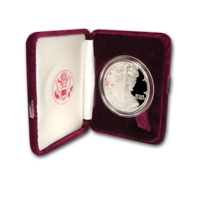 Der American Silver Eagle wird neben der Stempelglanz Variante auch in der höchsten Prägequalität Proof geprägt. Die Proofmünzen sind gekapselt, tragen ein Mintmark und haben ein mattes Motiv auf verspiegeltem Hintergrund. Die Ausgabe erfolge im Samtetui mit Echtheitszertifikat. Die Farben sowohl vom Etui als auch vom Zertifikat verändert sich mit der Zeit: 1986 bis 1993: lila, 1994 bis 2000: dunkelbalu, seit 2001 blau. Die Mintmarks zeigen den Standort der jeweiligen Prägeanstalt: S für San Francisco, P für Philadelphia und W für New York Beschreibung zur Münze: