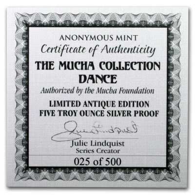 Es handelt sich hier um die Ausgabe Dance in 5 Oz Feinsilber und mit aufwendiger Antik Finish Veredelung, weltweit limitiert auf nur 500 Stück!