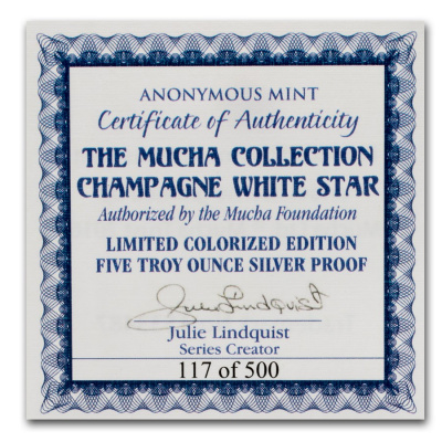 <<< USA - Alfons Mucha Kollektion Champagne White Star - 5 Oz Silber PP Color | |