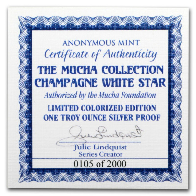<<< USA - Alfons Mucha Kollektion Champagne White Star - 1 Oz Silber PP Color | |