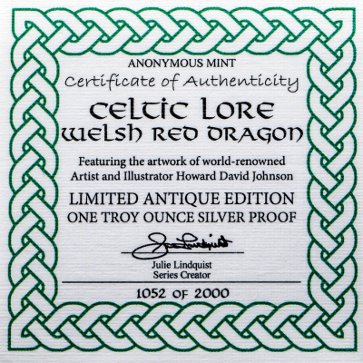 Die dritte Ausgabe dieser Serie zeigt den Red Welsh Dragon. Es handelt sich hier um die 1 Oz Feinsilber Ausgabe mit Antik Finish veredelt.