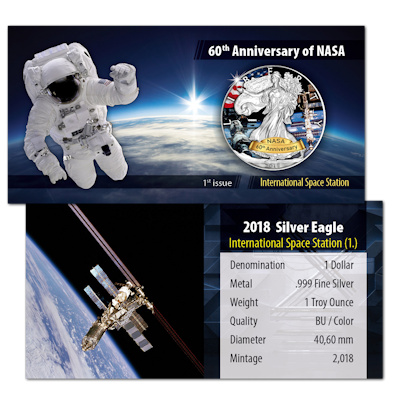 Der American Silver Eagle gehört zu den klassischen modernen Anlagemünzen und wird seit 1986 von der United States Mint produziert. Es handelt sich hier um die Ausgabe aus dem Jahr 2018 in der colorierten Sonderprägung 60 Jahre Nasa mit dem Motiv der Internationalen Raumstation (ISS). Die Ausgabe ist auf nur 2.018 Stück weltweit limitiert und wird gekapselt mit Produktkarte verausgabt.