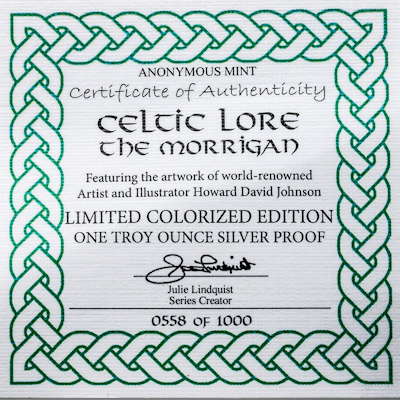 Die zweite Ausgabe dieser Serie zeigt The Morrigan. Es handelt sich hier um die 1 Oz Feinsilber Ausgabe in der höchsten Prägequalität Polierte Platte und zudem aufwendig coloriert.