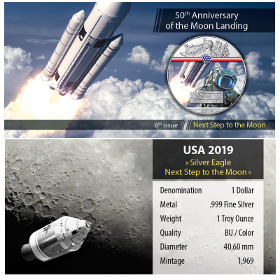 <<< USA - 1 USD Silver Eagle Next Step to the Moon 2019 - 1 Oz Silber Color | |