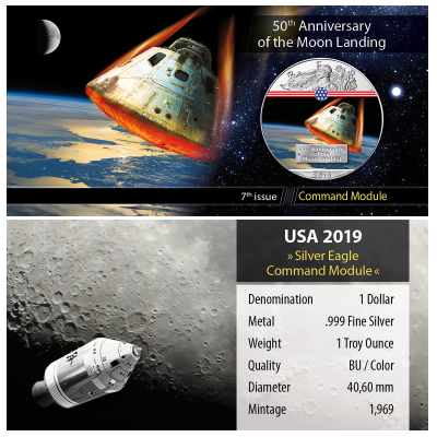 Der American Silver Eagle gehört zu den klassischen modernen Anlagemünzen und wird seit 1986 von der United States Mint produziert. Es handelt sich hier um die 7. Ausgabe aus dem Jahr 2019 in der colorierten Sonderprägung 50 Jahre Mondlandung mit dem Motiv des Kommando Moduls (Command Module). Die Ausgabe ist auf nur 1.969 Stück weltweit limitiert und wird gekapselt mit Produktkarte verausgabt.