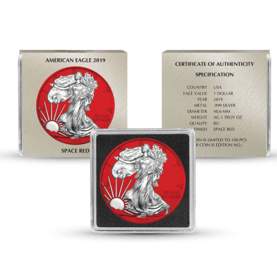 Der American Silver Eagle gehört zu den klassischen modernen Anlagemünzen und wird seit 1986 von der United States Mint produziert. Es handelt sich hier um die Ausgabe aus dem Jahr 2019 in 1 Oz Feinsilber in der Space Red Edition limitiert auf nur 100 Stück im Etui mit Echtheitszertifikat.