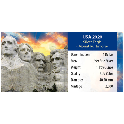 Der American Silver Eagle gehört zu den klassischen modernen Anlagemünzen und wird seit 1986 von der United States Mint produziert. Es handelt sich hier um die 2. Ausgabe aus dem Jahr 2020 in der colorierten Sonderprägung die Sehenswürdigkeiten (Landmarks) der USA mit dem Motiv Mount Rushmore. Die Ausgabe ist auf nur 1.969 Stück weltweit limitiert und wird gekapselt mit Produktkarte verausgabt.