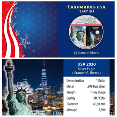Der American Silver Eagle gehört zu den klassischen modernen Anlagemünzen und wird seit 1986 von der United States Mint produziert. Es handelt sich hier um die 3. Ausgabe aus dem Jahr 2020 in der colorierten Sonderprägung die Sehenswürdigkeiten (Landmarks) der USA mit dem Motiv der Freiheitsstatue. Die Ausgabe ist auf nur 2.500 Stück weltweit limitiert und wird gekapselt mit Produktkarte verausgabt.
