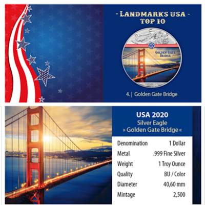 Der American Silver Eagle gehört zu den klassischen modernen Anlagemünzen und wird seit 1986 von der United States Mint produziert. Es handelt sich hier um die 4. Ausgabe aus dem Jahr 2020 in der colorierten Sonderprägung die Sehenswürdigkeiten (Landmarks) der USA mit dem Motiv der Golden Gate Bridge. Die Ausgabe ist auf nur 2.500 Stück weltweit limitiert und wird gekapselt mit Produktkarte verausgabt.