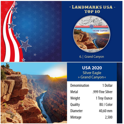 Der American Silver Eagle gehört zu den klassischen modernen Anlagemünzen und wird seit 1986 von der United States Mint produziert. Es handelt sich hier um die 6. Ausgabe aus dem Jahr 2020 in der colorierten Sonderprägung die Sehenswürdigkeiten (Landmarks) der USA mit dem Motiv des Grand Canyon. Die Ausgabe ist auf nur 2.500 Stück weltweit limitiert und wird gekapselt mit Produktkarte verausgabt.