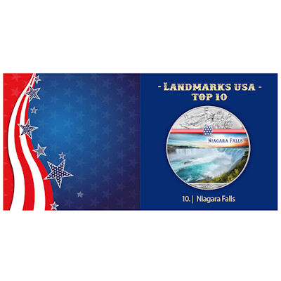 Der American Silver Eagle gehört zu den klassischen modernen Anlagemünzen und wird seit 1986 von der United States Mint produziert. Es handelt sich hier um die 10. Ausgabe aus dem Jahr 2020 in der colorierten Sonderprägung die Sehenswürdigkeiten (Landmarks) der USA mit dem Motiv der weltbekannten Niagara Fälle. Die Ausgabe ist auf nur 2.500 Stück weltweit limitiert und wird gekapselt mit Produktkarte verausgabt.