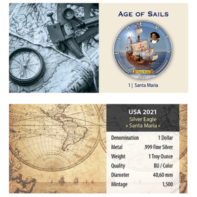 Der American Silver Eagle gehört zu den klassischen modernen Anlagemünzen und wird seit 1986 von der United States Mint produziert. Es handelt sich hier um die 1. Ausgabe aus dem Jahr 2021 aus der Serie Zeitalter der Segler und zeigt die Santa Maria. Die Münze besteht aus 1 Oz Feinsilber in der Prägequalität Stempelglanz und ist aufwendig coloriert sowie auf nur 1.500 Stück weltweit streng limitiert. Die Auslieferung erfolgt gekapselt mit Produktkarte.