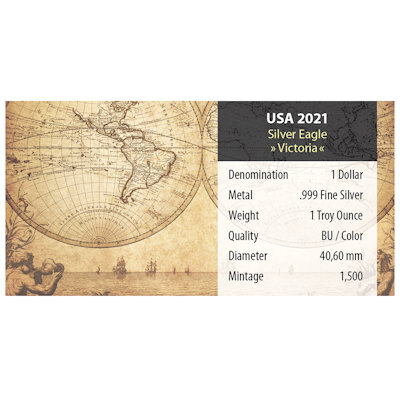 Der American Silver Eagle gehört zu den klassischen modernen Anlagemünzen und wird seit 1986 von der United States Mint produziert. Es handelt sich hier um die 6. Ausgabe aus dem Jahr 2021 aus der Serie Zeitalter der Segler und zeigt die Victoria. Die Münze besteht aus 1 Oz Feinsilber in der Prägequalität Stempelglanz und ist aufwendig coloriert sowie auf nur 1.500 Stück weltweit streng limitiert. Die Auslieferung erfolgt gekapselt mit Produktkarte.